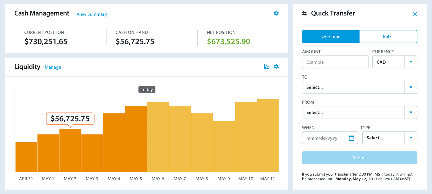 A design concept created in response to an RFP from ATB Financials product group, the request was to have their online business banking portal redesigned in a way that offered more effective storytelling via data visualization and gave quick access to key user tasks like transferring funds. The interface was modernized and designed to be fully responsive. In addition to interface design, the project included user testing and persona development.